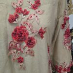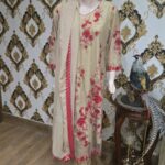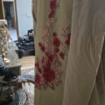 A classic beige net shirt adorned with intricate red bead and thread work, creating a striking contrast. Paired with a matching dupatta and trouser, this elegant ensemble is perfect for festive