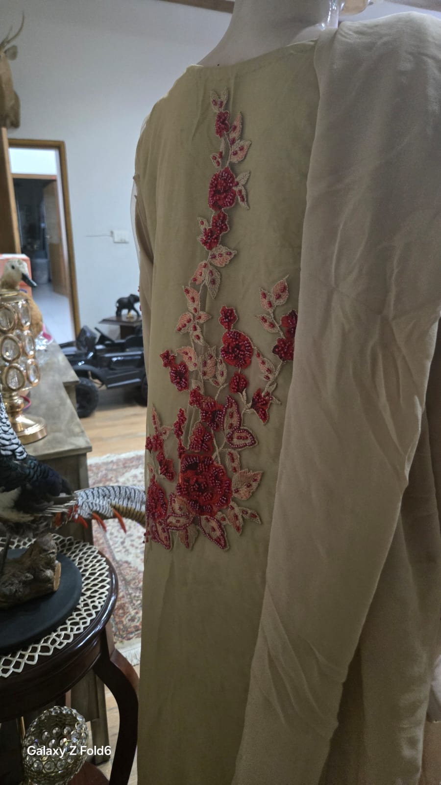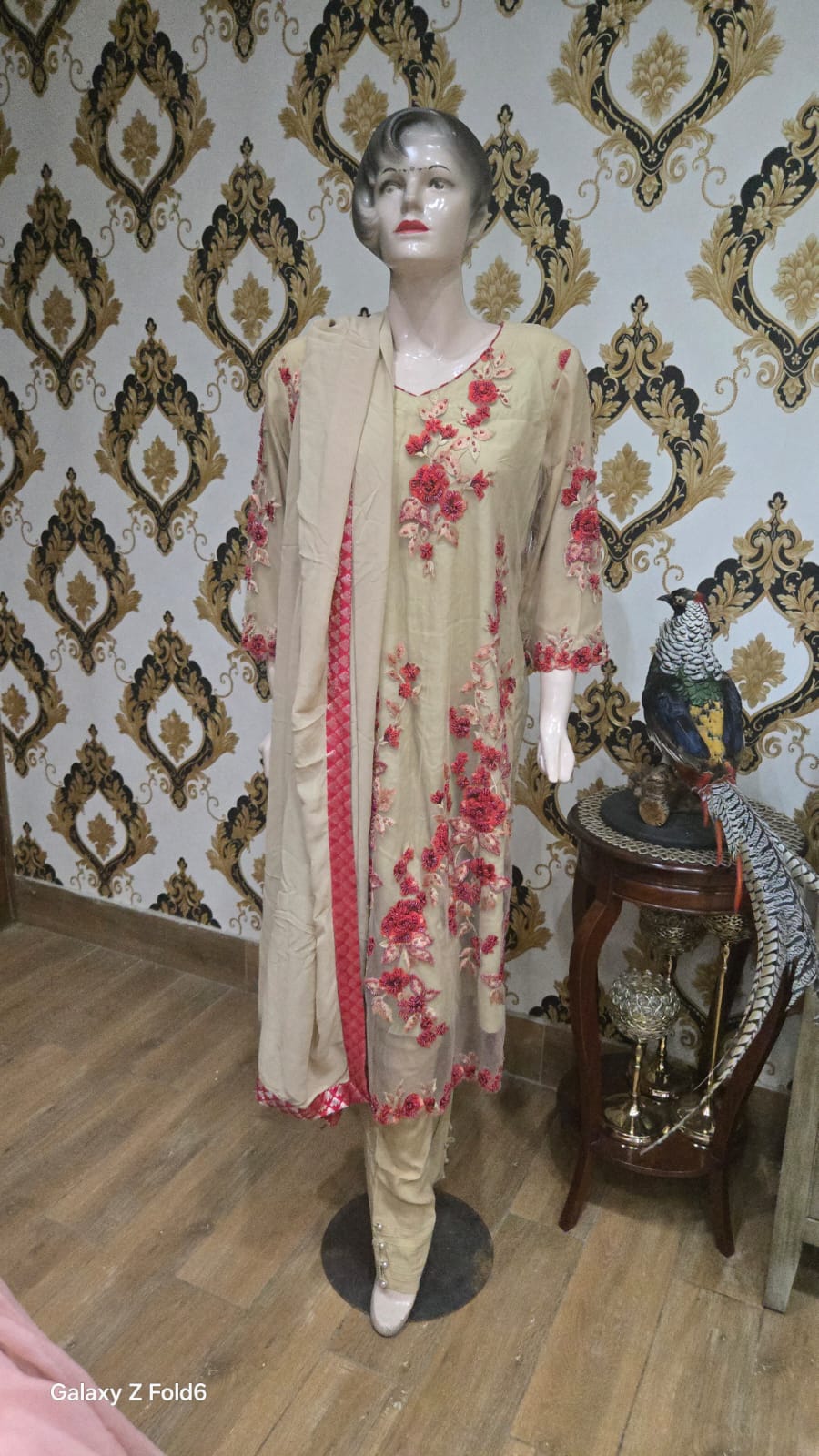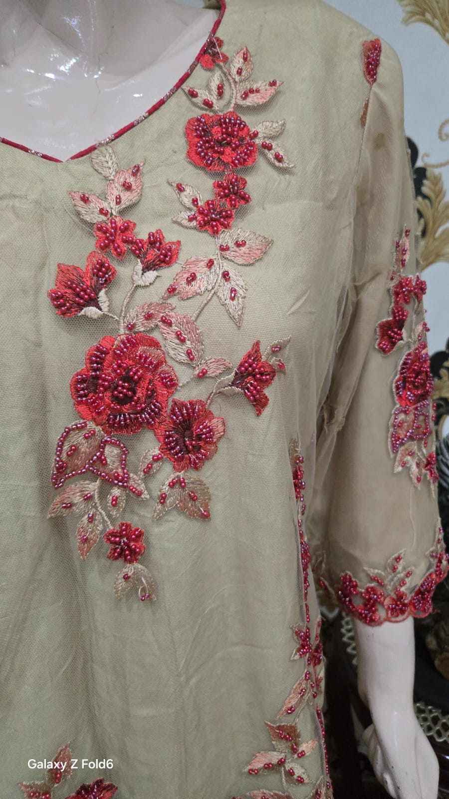 A classic beige net shirt adorned with intricate red bead and thread work, creating a striking contrast. Paired with a matching dupatta and trouser, this elegant ensemble is perfect for festive
