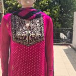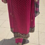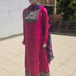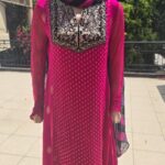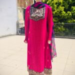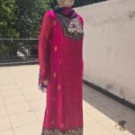 Embrace timeless elegance with Pink golf, a graceful pink embroidered chiffon suit designed for the modern woman who loves tradition. The rich pink hue, paired with detailed golden thread embroidery on the neckline and hem, gives this outfit a luxurious and festive look.