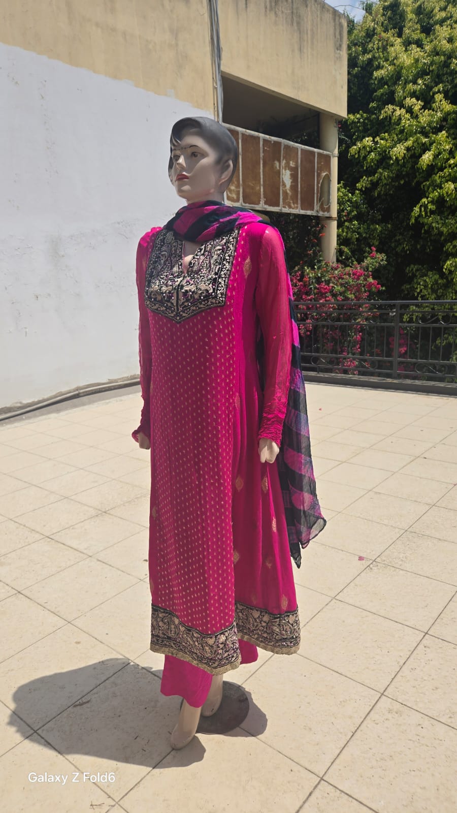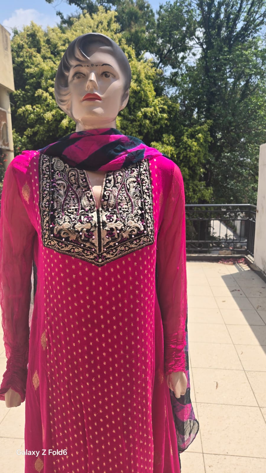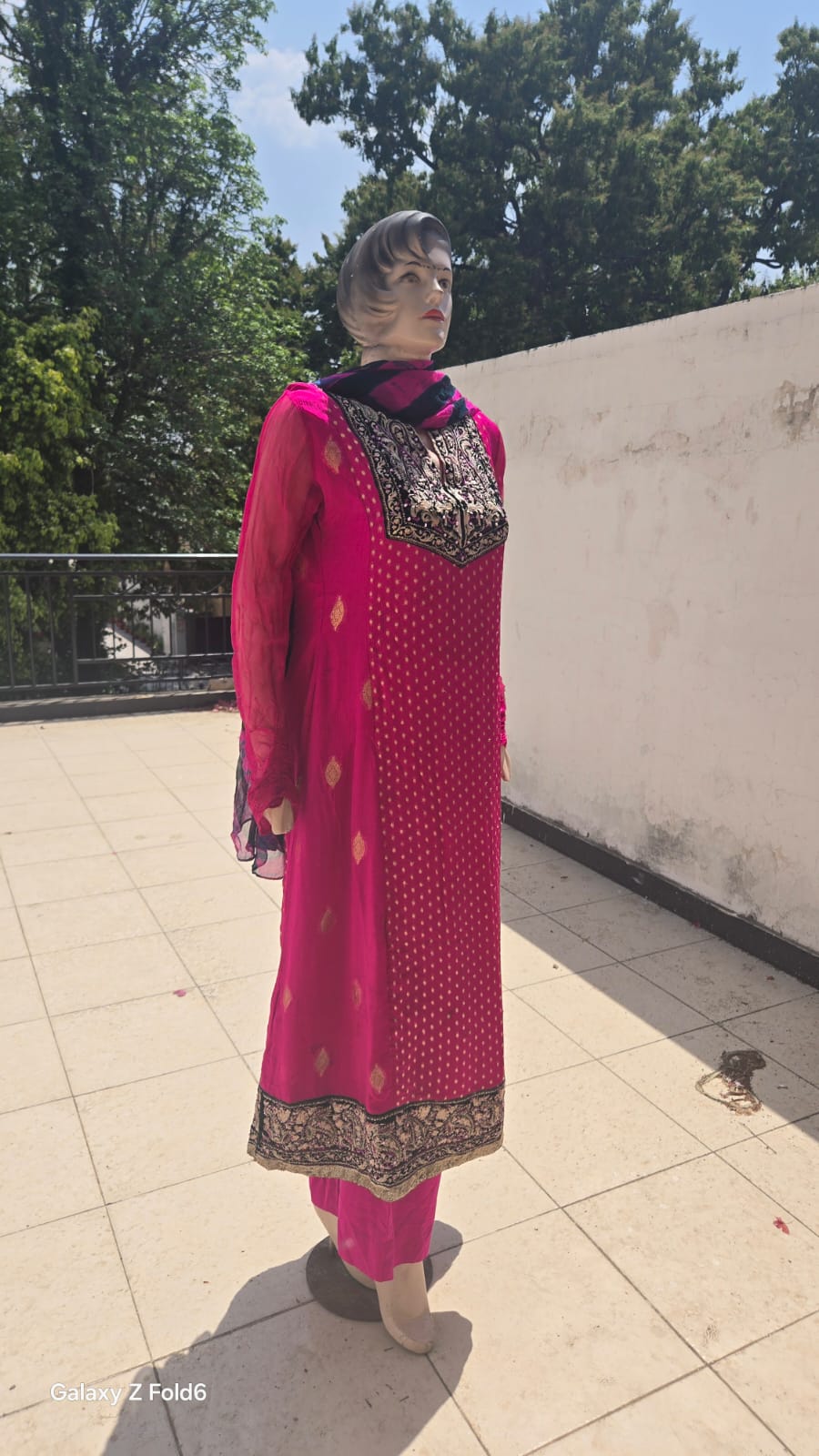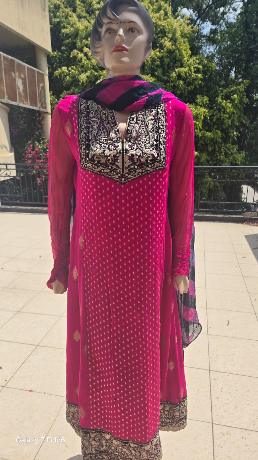 • Shirt: Embroidered chiffon with intricate neckline and border detailing